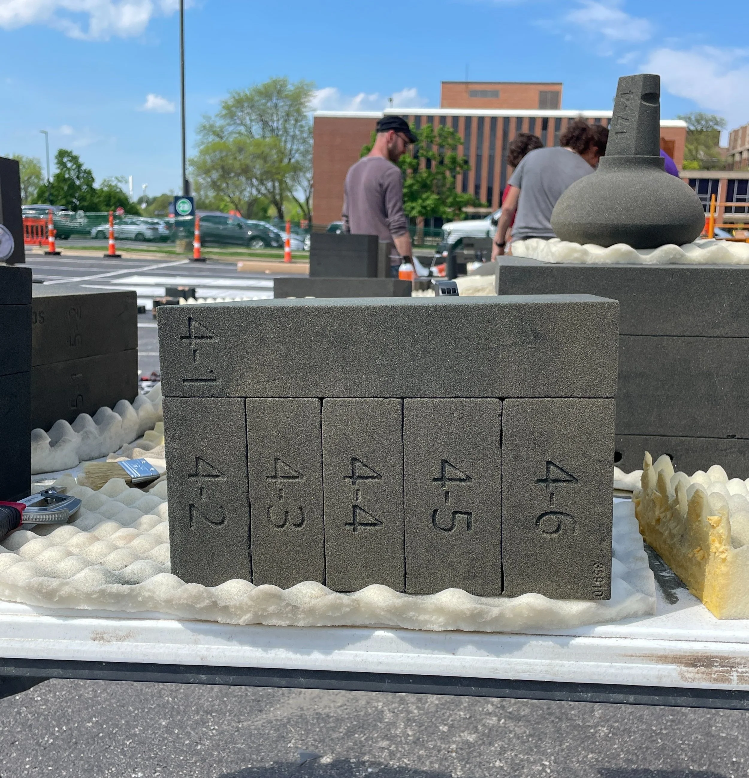 I produced a sand mold based on my design through binder jetting - a 3D printing process. Before the pour, I cleared the sand from the negative section and used a series of dowel pins to assemble the cope, drag, and cheeks of my mold, then bound them together with steel ribbon